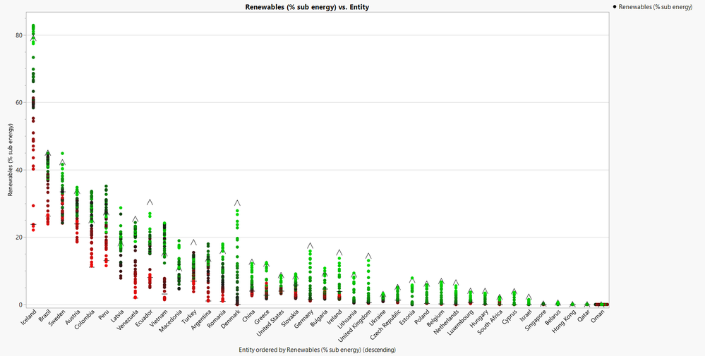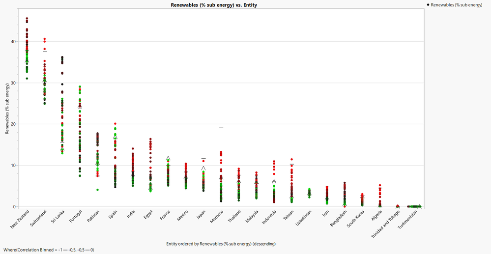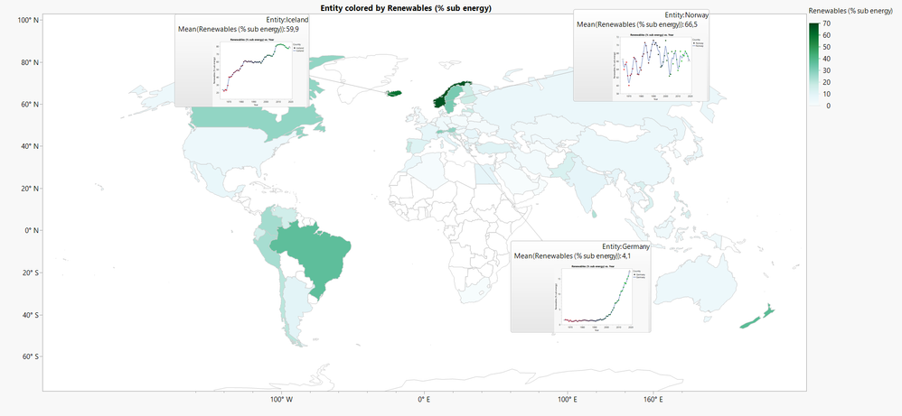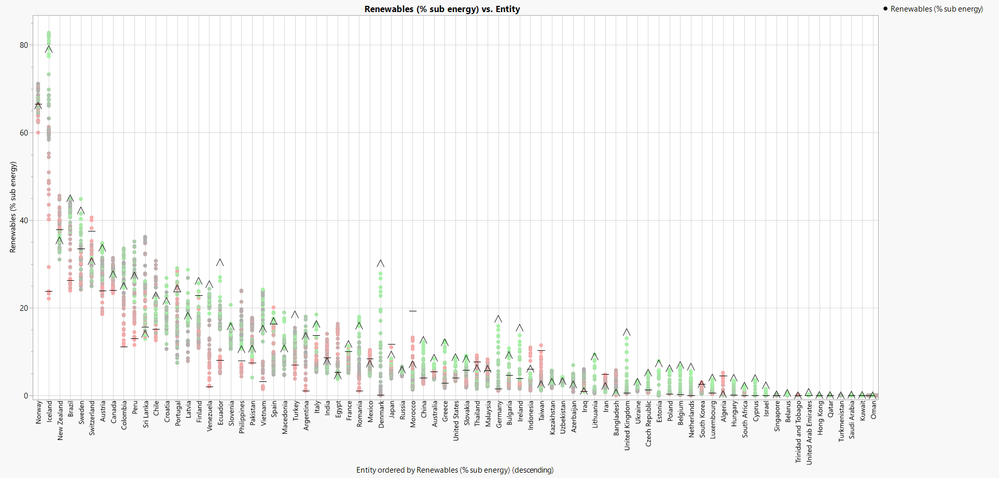 I can now use this cluster column as a Local Data Filter to view positive or negative trends of primary renewable energy consumption. Below is an example of countries with positive renewable energy consumption trends.