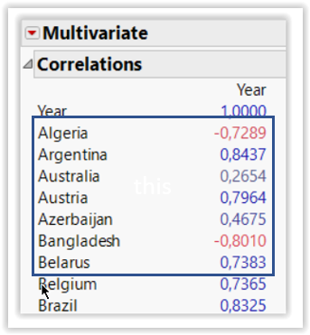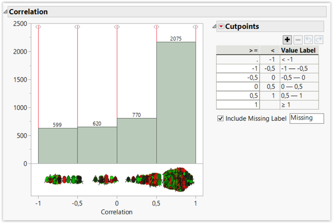 I generated a new data table with the Pearson correlation coefficients and joined it to the initial data set. To get clusters of positively versus negatively evolving countries, I used the binning formula (new in JMP 16) that allows the correlation coefficients to be binned into four different groups: -1 to -0.5; -0.5 to 0; 0 to 0.5; 0.5 to 1.