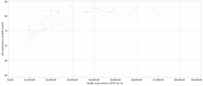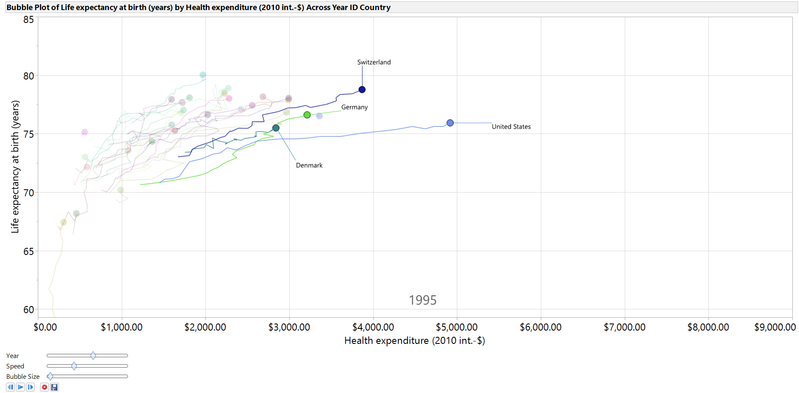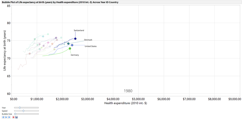 To show the entire trend, I saved the bubble plot as an animated gif, a new option in JMP 14. As you can see, the trend for most of the countries is toward a longer life expectancy and higher health care expenditures. Clearly, the country with the biggest increase in health care expenditures is the United States.