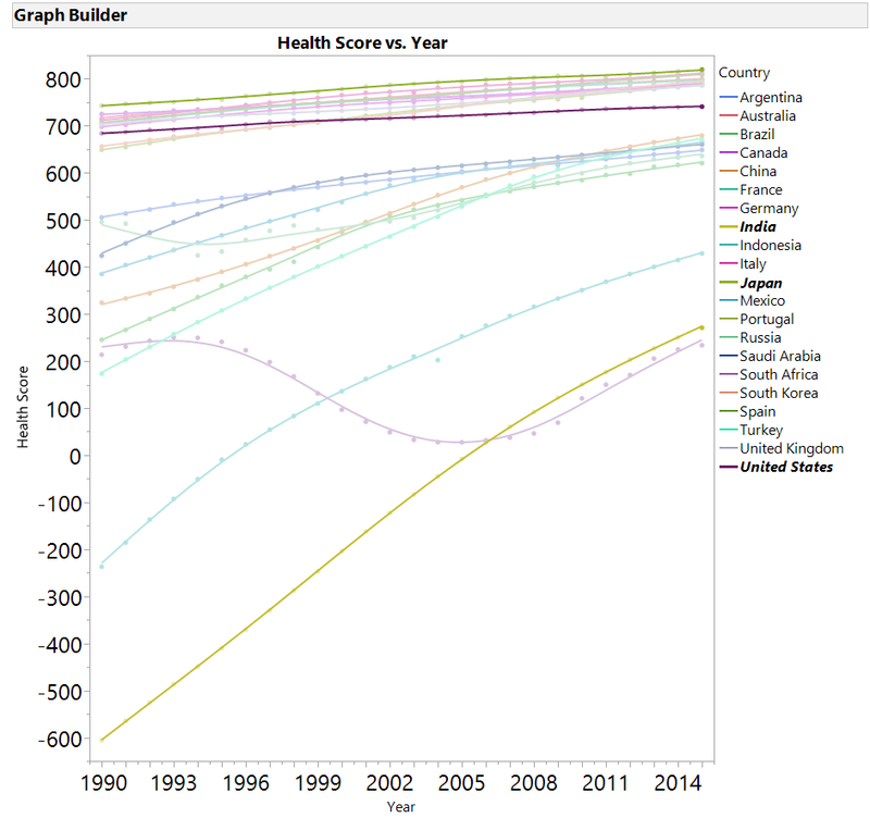 I did not get this health score calculation from any source. I determined this on my own. If we look at just the G20 countries from 1990-2015, we can see how each country is performing. As you can see, most countries have an improving health score over this 25-year period. I have highlighted three countries: India, Japan and the United States.
