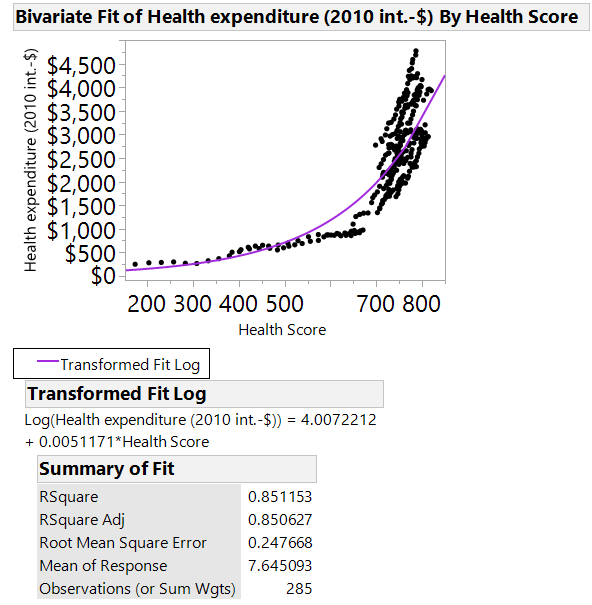I decided to evaluate what health care should cost based on outcomes. I wanted to look only at the G20 countries from 1990-2015, so I made a subset of the data for making the model. I excluded the US from the model building process since it was such an outlier on cost. I ran a Fit Y by X in JMP for the Health Expenditure vs. Health Score. When I looked at the relationship, it appeared that using a natural log transformation for the Health Expenditure would fit the data better than a polynomial.