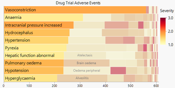 The size of the bars represents the number of occurrences, and the color represents the average severity. The secondary colors are still faded to keep the primary categories in focus, but they don’t have to be if a truer color representation is important.