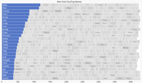 An advantage of having a true x axis (unlike a treemap) is the ability to estimate the grand sum for the entire population. In this case, we have 25 rows, and each goes to just over 4,000 on the count axis. We can estimate the number of dogs at 25 x 4,000+ = 100,000+.