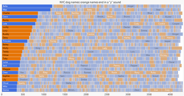 The nicardipine example showed the use of a continuous color scale for the bars. With categorical coloring, the fading is less likely to complicate the color interpretation. In this view of the dog names, I used orange for names that end in a “y” sound.