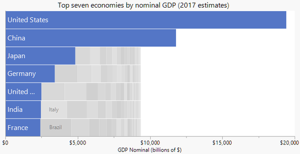 Sometimes the values are so skewed that the secondary fill doesn’t surpass the primary bars. That’s the case when charting world economies by nominal GDP. This packed bar chart highlights the top seven of 192 world economies. (Not the quite same as the G7, by the way).