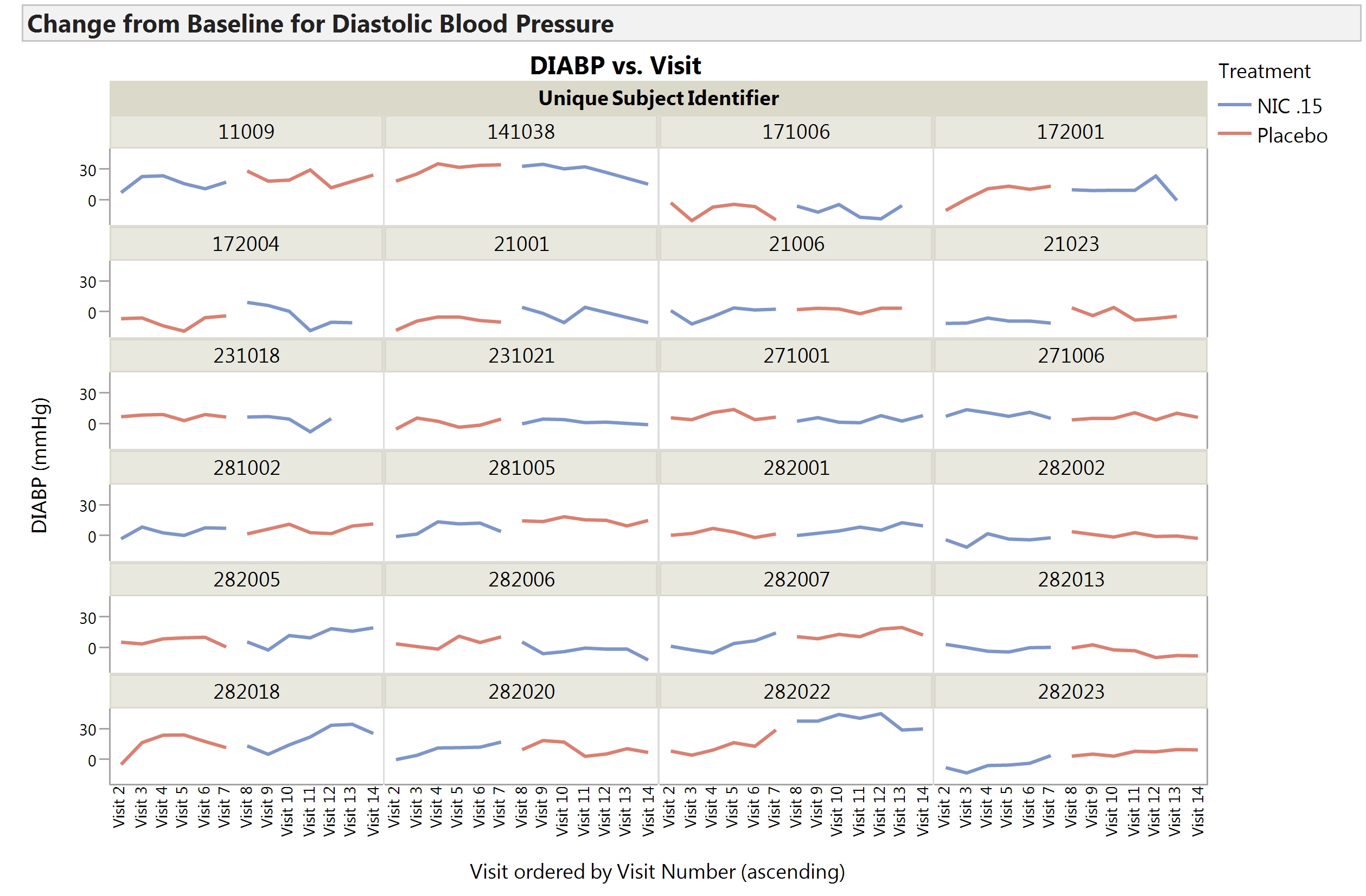 Consider a simple two-period AB/BA crossover design. Using mock data from our example Nicardipine study, assume we have a crossover trial for safety analysis with 24 patients. Patients were randomized to receive either Nicardipine (NIC .15) or placebo in the first week and vice versa in the second week. New views and options in the Findings Time Trend Analysis process support crossover visualization to easily see the trends in vital signs (for example) across treatment periods.