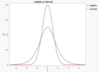 To wrap things up for this post, let’s talk about the two symmetrical distributions, the normal and logistic, and their log complements. Most of you should be familiar with the normal and lognormal, and they’re both available under Distribution. Let’s focus on the other two, the logistic and log logistic. The logistic distribution concentrates more observations in its tails than the normal. This is helpful when there are more observations in extremes than would be predicted by the normal. Below is a comparison of the normal and logistic both with 𝛍 = 0 and σ = 1.