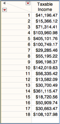 After pressing “OK” to close the formula editor and “OK” to close the column properties editor, we find that the tax has been computed for each row in the income table, and see by the “+” icon that the tax is formula-based; the lookup table needs to be open whenever you wish to re-evaluate the formula. (If you prefer to remove the formula at this point, simply click on the “+” icon, select “Clear” when the formula editor opens, then click “OK.”)