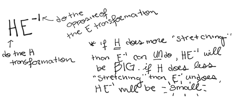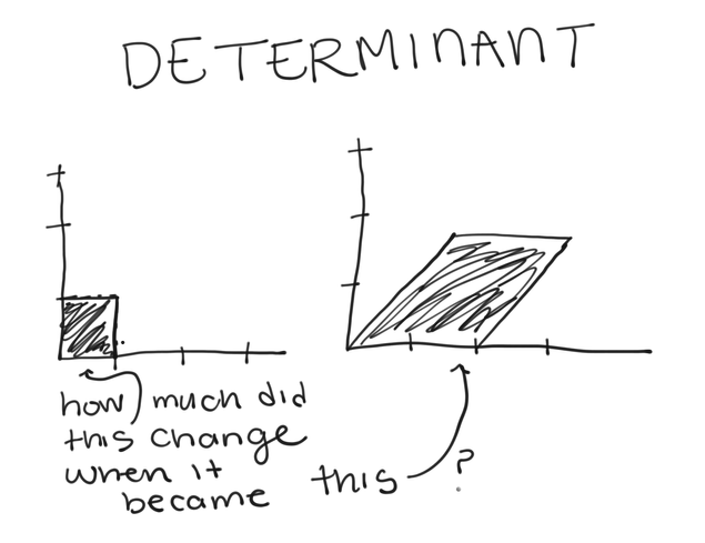 The amount of “stretching”– or conversely, “squishing”– a matrix does is represented by its determinant. Matrices that stretch things have large determinants, and matrices that squish things have small determinants.null10