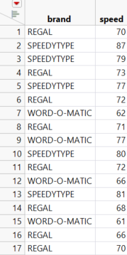 Today’s example involves three brands of typewriters (Regal, Speedtype, and Word-O-Matic) that were tested for typing speed. There are two columns in this table: brand and speed. The table can be downloaded if you want to follow along; it’s an attachment to this blog post.