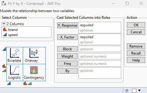 To perform a one-way ANOVA, start by selecting the Fit Y by X option under the analyze menu. Next, drag-and-drop click the continuous response variable (in this case, “speed”) to the Y role and the categorical factor variable (“brand”) to the X role. Click OK. The report initially contains a scatter plot of speed vs. brand.