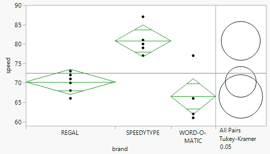 The report now includes comparison circles to the right of the initial scatter plot. These circles provide an interactive visual representation of group mean comparisons. Circles for significantly different means do not intersect or very slightly intersect. Click the circle associated with the Word-O-Matic brand and observe how both it and the Regal brand are highlighted in red. Red circles correspond to groups with means that are not significantly different. The Speedtype circle is gray and does not intersect with the other two brands’ circles, which signifies that the Speedway mean is significantly different from the highlighted group of Regal and Word-O-Matic.