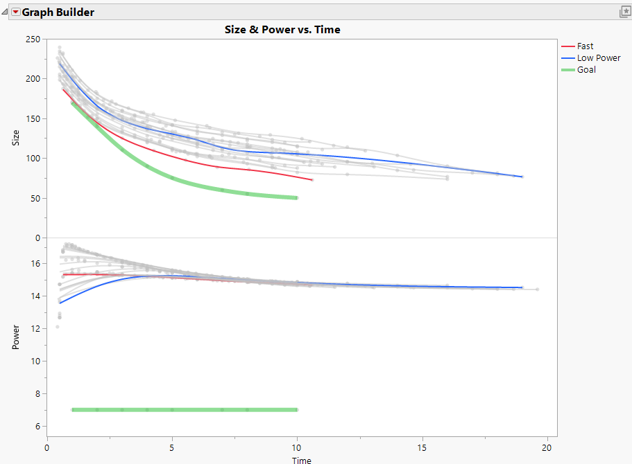 This is now a good data set to illustrate how to optimize competing curves: I'd expect that using more power will cause the process to reduce the particle size faster, and I'd hope that there is a happy spot in the design space where power usage can be low and where the milling process can be quick. In the graph below, I can see that the fastest DOE run (red line) is near the middle on power usage, and the lowest power usage (blue line) is largely in the middle for the milling process time. The green lines represent target curves for each output.