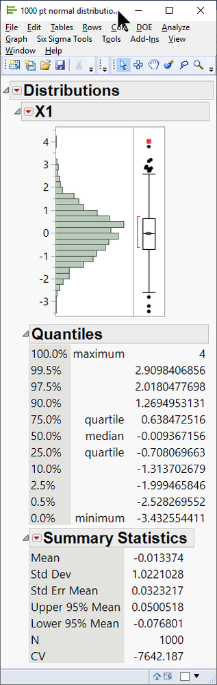 Figure 3 shows the Distribution platform output for the 1,000 sample data from my previous blog post. These samples are drawn from a random normal distribution, with mean of 0.0 and standard deviation of 1.0. I also include the point at X1=4 which was visually identified as an outlier in my previous post: