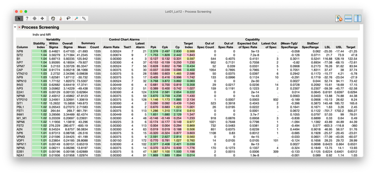 The resulting template generates an overview of the process with the Process Screening platform. There is also the Process Capability platform for context and individual control charts to focus on specific conditions.