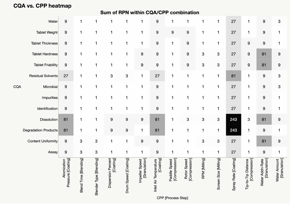 This process parameter risk ranking can then be used as a guide for what parts of the process and what process parameters need closer attention during the development cycle. In the example above, the Coating step in the process has the most factors with a high RPN, so that step would definitely require further study and characterization.