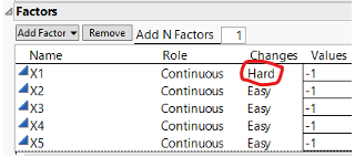 When adding factors, use the drop down menu to identify your variable as “Hard” to change, this will create a Split Plot design, which will order your trials such that the hard to change factor, changes as little as possible (among other things).