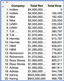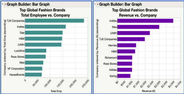 My first thought is to use bar graph charts in JMP Graph Builder to see the top 10 global fashion companies. What you see below are my first efforts in creating two horizontal bar charts that are ordered by magnitude, one for employees and one for revenue. However, showing separate graphs for each can hamper true insights as you may miss things when you switch your eyes back and forth between the two graphs. For example, while you might fixate on the fact that the TJX Companies (owner of TJ Maxx and Marshall retail stores) dwarfs the others in terms of total employee size in the first graph, you might not easily notice that TJX is only the fourth-largest in revenue in the second graph. It would be better to have a single graph view that can show all the information.
