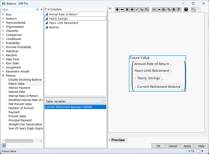 After this, it's time to create the formula in the Balance column. This is really easy, since it's already included with JMP. However, two parts might not be obvious: