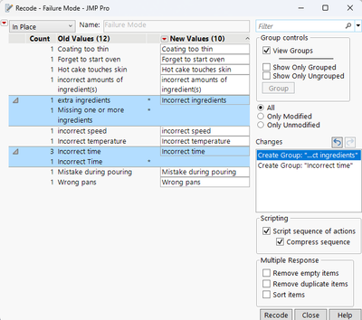 - Multiple Responses: The Failure Mode, Failure Effects, and Causes columns all contain comma-separated lists. Changing the modeling type for these columns to Multiple Response allows JMP to separate all these responses automatically. This means that analysis platforms and the header graphs will update to show recurring values, which is helpful for spotting trends such as "Incorrect time" in the Failure Mode column. Using multiple response columns speeds up both data entry and analysis.