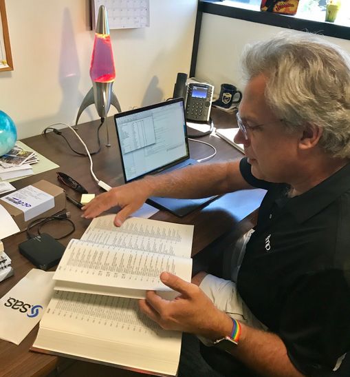 JMP developer Michael Hecht pages through The Unicode Standard 4.0 in his office. JMP recently adopted a Unicode character, the lightbulb emoji.