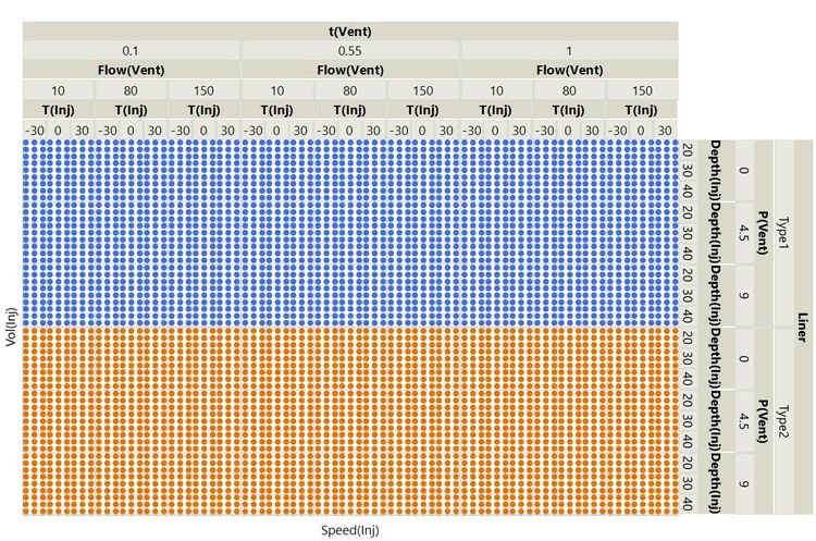 What about Liner type? That factor is different because it can only be Type1 or Type2. We say it is a categorical factor, whereas the others are continuous factors. We would test each of the 2187 combinations with the two different liner types, giving a total of 4374! You can count the dots if you don’t believe me.
