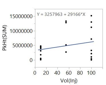 • The intercept parameter tells us that we can expect a PkHt(SUM) of 3257963 when the injection volume is 0 microlitres.