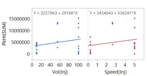 We now want to use this data to build useful models. A straight-line fit is one of the simplest statistical models that we can create. It can also be a very useful model. So let’s start simple by fitting a straight line to PkHt(SUM) versus Vol(Inj):