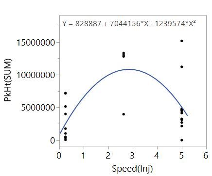 The data tells us that the slope of the relationship between PkHt(SUM) and Speed(Inj) is changing with Speed(Inj) and there is a maximum near the centre of the range. The quadratic model,