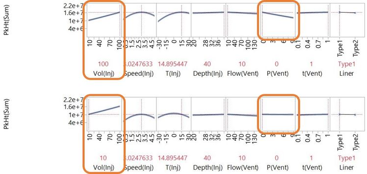 If we don’t understand interactions, we don’t understand our process, and we will struggle to find the best settings. In this example, the largest peaks are with high Injection Volume and low Vent Pressure. We wouldn’t know that if we didn’t understand the interaction of these factors.