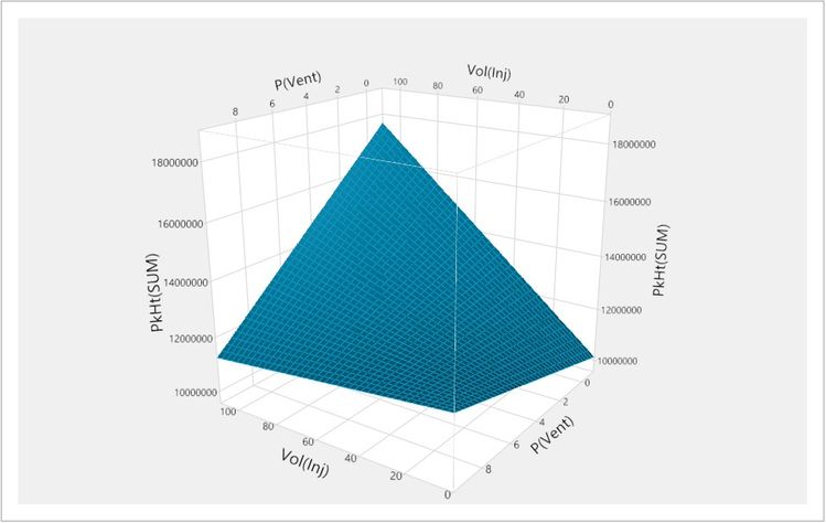This illustrates the importance of thoroughly exploring the possibility space. We can only understand this behaviour by testing combinations that cover the extremes of the possibilities. If we had only experimented with P(Vent) set at the highest setting in the range, we would have concluded that Vol(Inj) has little effect on PkHt(SUM). This is one of the disadvantages of one-factor-at-a-time or OFAT experimentation.