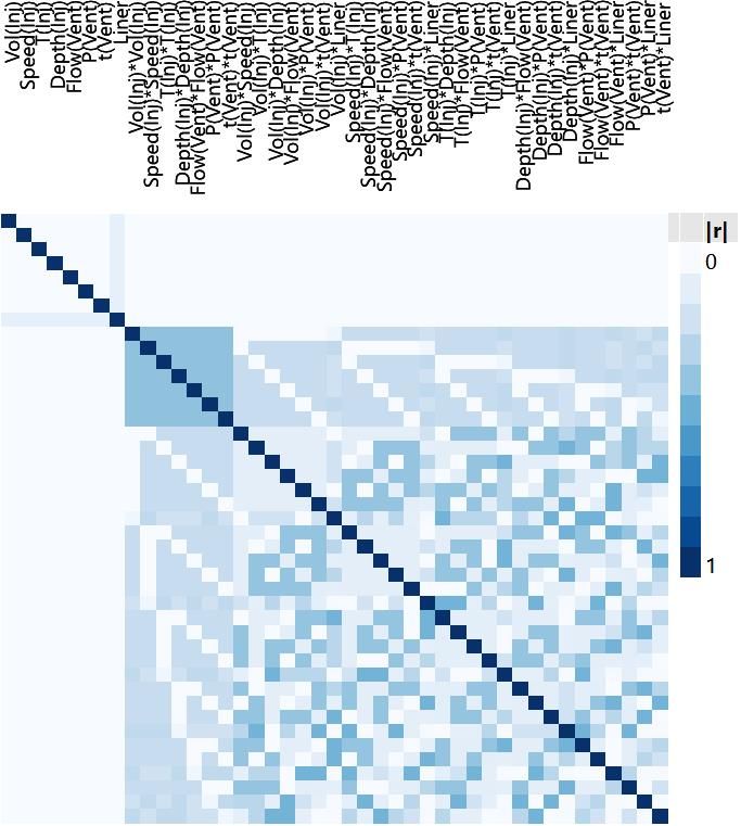 The number of two-factor interactions for our eight-factor example is therefore 7 + 6 + 5 + 4 + 3 + 2 + 1 = 28. To see how well we can understand all of these interactions, we can look at the correlation colour map.