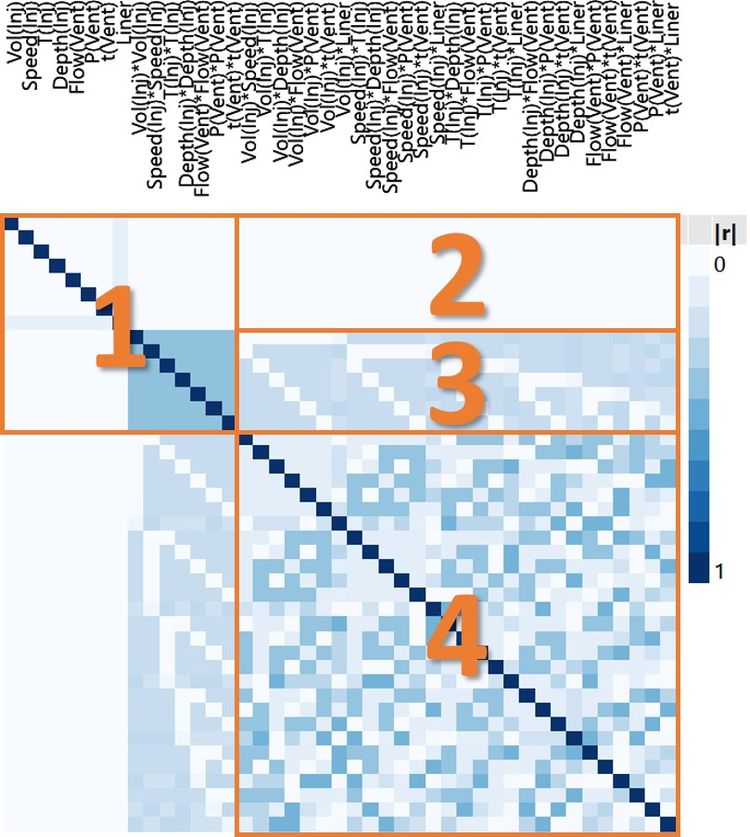 From this colour map, we see that we can understand the main effects of our factors with clarity because they are not correlated with the quadratic or two-factor interactions (together we would call these the second-order effects). We will also be able to estimate any important second-order effects because there is no confounding between any of them. And all in relatively few runs.