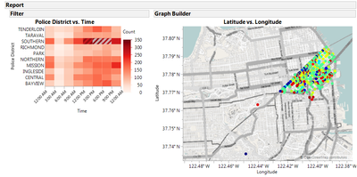 This example includes a Graph Builder heatmap used to filter a Graph Builder point element of crimes in the San Francisco area. Opening the .jmpapp file will run the application, while opening the .jmpappsource file will open the Application Builder to edit the report.