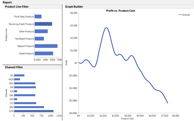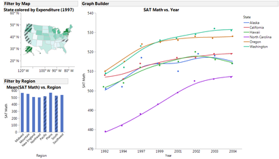 This example uses two reports to filter a single result graph. One filter uses a map representation of the US states, while the other is a bar chart of geographic regions. There is a single Data Filter Source Box surrounding the two filters, which means that they share a selection state. Selections within one filter are linked to the other filter, and can be combined using ctrl+click to extend the selection.