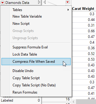 - Click the red triangle next to the data table name in the table panel and select Compress file when saved.