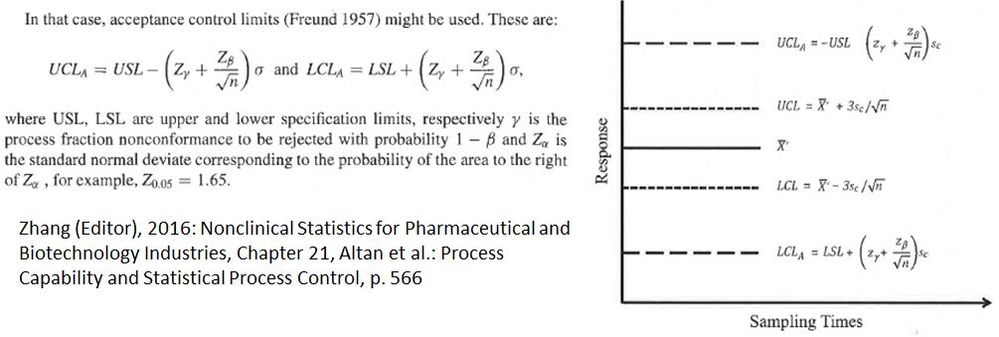 Introduced by Friend in 1957, the illustration below provides the formula and a chart that uses Acceptance Limits in conjunction with standard Shewhart Control Limits, published in Zhang (Editor), 2016: Nonclinical Statistics for Pharmaceutical and Biotechnology Industries, Chapter 21, Altan et al.: Process Capability and Statistical Process Control, p. 566.