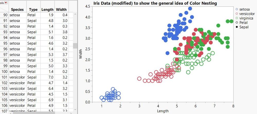 Color Nesting is supposed to mean that I can first drag Species to the Color field to set main colors and then drag Type to the top middle section of the Color field to let JMP choose shades of the main colors for the levels of the nested color variable. The second graph below shows the result doing this manually (combining Species and Type to use as a color variable and then picking colors).