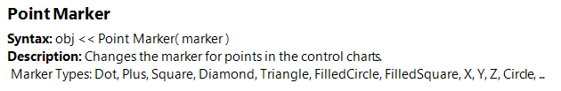 Document the names of the markers. In https://community.jmp.com/t5/Uncharted/Integrate-Interpolate-and-SplineEval/bc-p/657963#M381 it isn't clear that 12 or 16 is a circle or a diamond. As far as I can tell, the pdf doc does not list the names. The scripting index does, incomplete..., here: