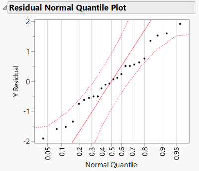 If I save the residuals to a new column and regenerate the Normal Quantile Plot from the Distribution plot, the line is based on the standard deviation of the Residual Y column of 1.03. It looks like a much more sensible fit from a model diagnostics perspective.