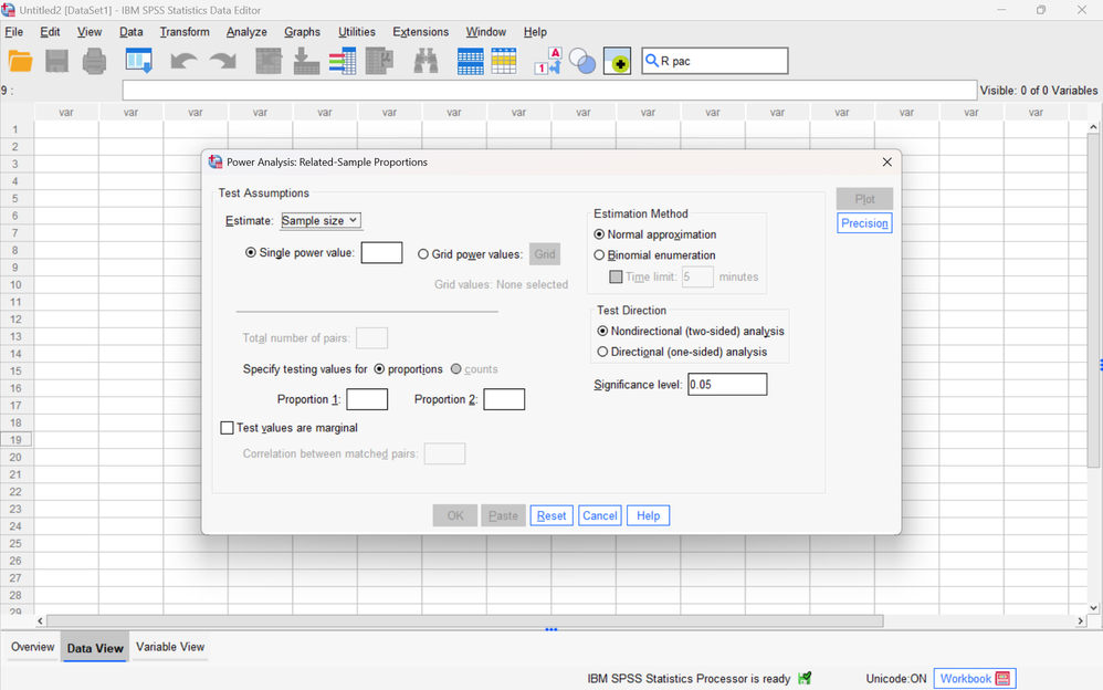Hello thiennguyen. Adding to this conversation... Under the JMP sample size explorers you will find several options for computing power for various scenarios. It is hard for us to compare calculations to what SPSS is doing in their related samples proportion calculator since we do not have access to their computations. One thing you could try in JMP is using the one sample proportion calculator for the paired sample data. This should give a reasonable estimate assuming you want the null hypothesized difference in sample proportions to be zero and the alternative hypothesized proportion would whatever difference you wish to be able to detect. It would be very interesting to see how these computations compared to the SPSS related samples computations under the same conditions.
