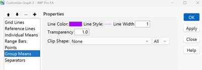 1. The top chart with the raw data is clunky when customizing the Group Means and Connect Cell Means. You need to right-click then Customize in the white space of the graph, which is hidden for most people. Once the Group Means is found, it doesn’t really work since the reference is actually a purple line that doesn’t match what’s in the graph. It would be best if the legend in the top right could be interactive as it does in Graph Builder (Overlay, Color) or Fit Y by X (Compare Densities graph).
