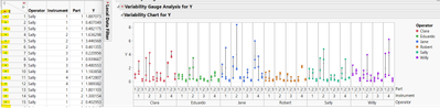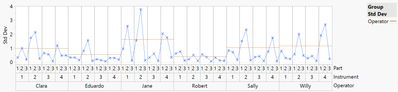 2. The default Std Dev chart has no separation panels. If there are at least 3 X variables and I add the Group Means for Std Dev, the grids will enter for all X variables. The grids should match the X variables shown. A snippet of this output is shown below (only Operator was selected).