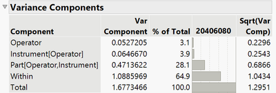 6. A smaller issue I have is with the variance components. The 20/40/60/80 % labels for the graph seem like a good idea, but they tend to just be smushed together and not really add clarity. You could argue that removing the label would be similar to how the Effect Summary displays the p-values in the Fit Model platform where you have hashmarks representing 0.1/0.01/0.001, etc.