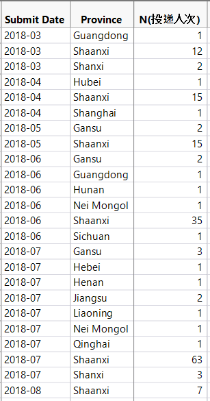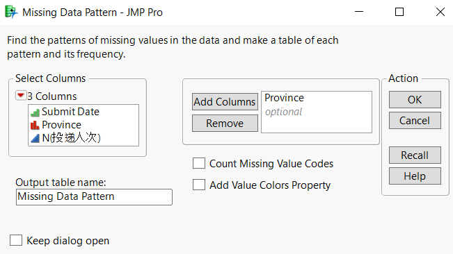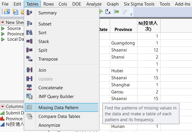按照戶口省份經過整理後的表頭分別是Submit Date(投遞日),Province(戶口省份),N(投遞人次)。接下來,我們將通過簡單的資料處理,來鎖定我們需要分析的有效目標資料。打開JMP——Table(表)功能表,選擇Missing data pattern(缺失資料模式)選項: