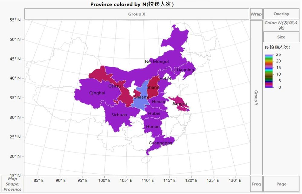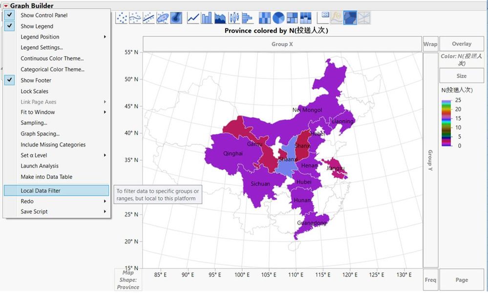 再把資料表中的N(投遞人次)一列按照紅色箭頭拖拽到右側Color一欄。這時,JMP會幫助在省份上著色並自動生成legend(圖例)顯示在圖形右側。當然省份一定是有數值的,否則仍然會呈現空白色。
