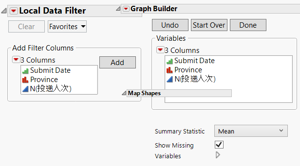 在JMP軟體中,打開Graph(圖形)— Graph Builder(圖形生成器),將資料表中的Province(省份)一列按照藍色箭頭拖拽到面板中,這時要注意在左側下方要圈選上 Show missing選項,以便將中國大陸整體的地圖輪廓呈現出來。