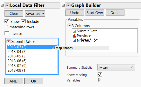 JMP就會按照月份自動分割成按月份計數,還可以點擊local data filter左上方的小紅箭頭: