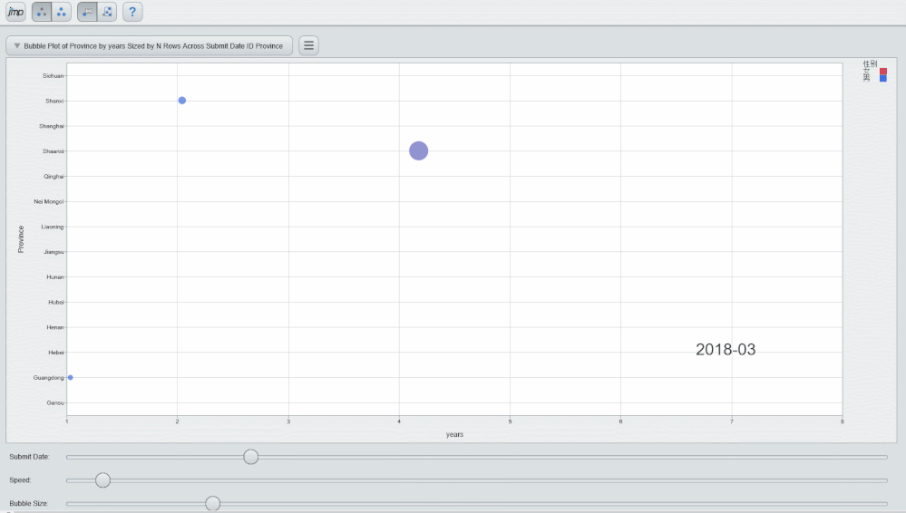 此外,我們還可以利用JMP提供的動態氣泡圖製作以下效果,以各個職位應徵者的工作或者實習年限作為橫軸,以各個省份作為縱軸,藍色和紅色分別代表男性和女性,再以月份作為時間節點,其中氣泡的大小代表投遞人的數量。