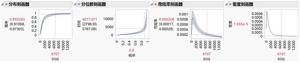 利用這些圖形就可以形象地解釋第一個問題“該產品的失效特性如何?”了。現在我們來回答第二個問題“當失效概率為90%時,該產品的可靠壽命是多少?”在“分位數刻畫器”的X軸上輸入“0.9”,就可以在Y軸上得到紅色數值“4017.671”和黑色數值“[2798.93,5767.09]”,表明此時的可靠壽命應該是4017.671,其置信區間應該是[2798.93,5767.09]。